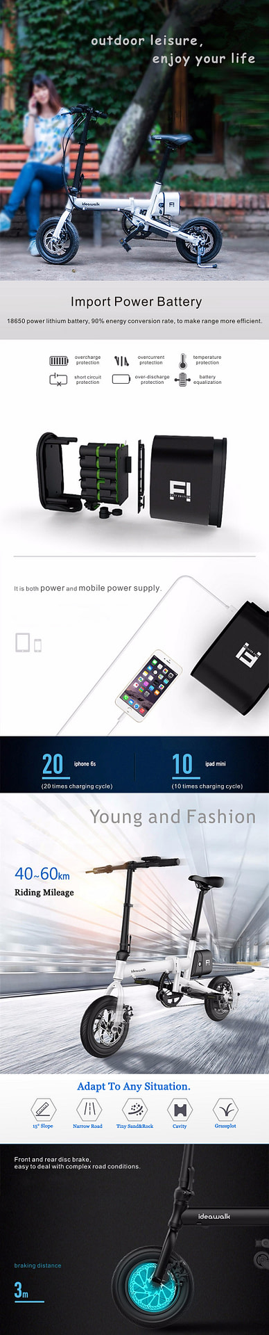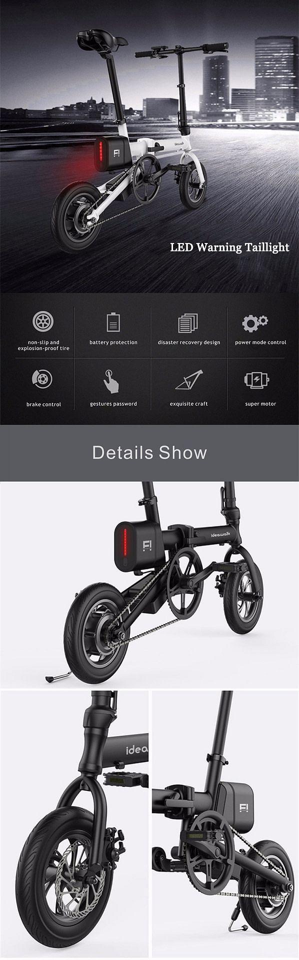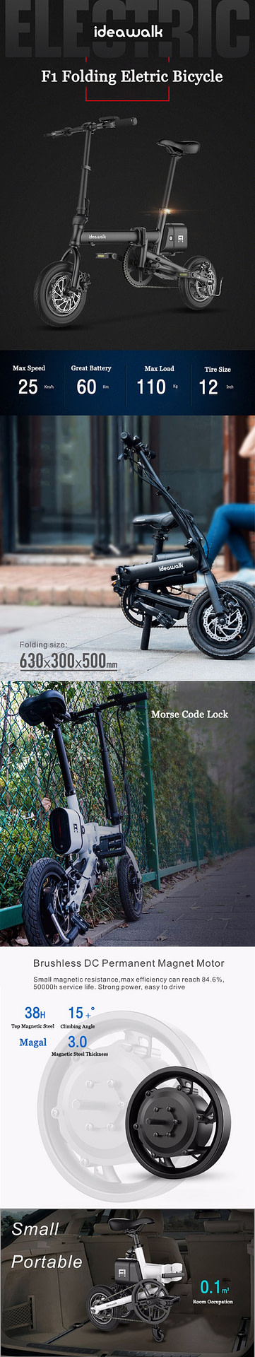 Ideawalk F1 36V 250W motor sin escobillas 12 pulgadas negro plegable bicicleta eléctrica 25km / h 60KM kilometraje